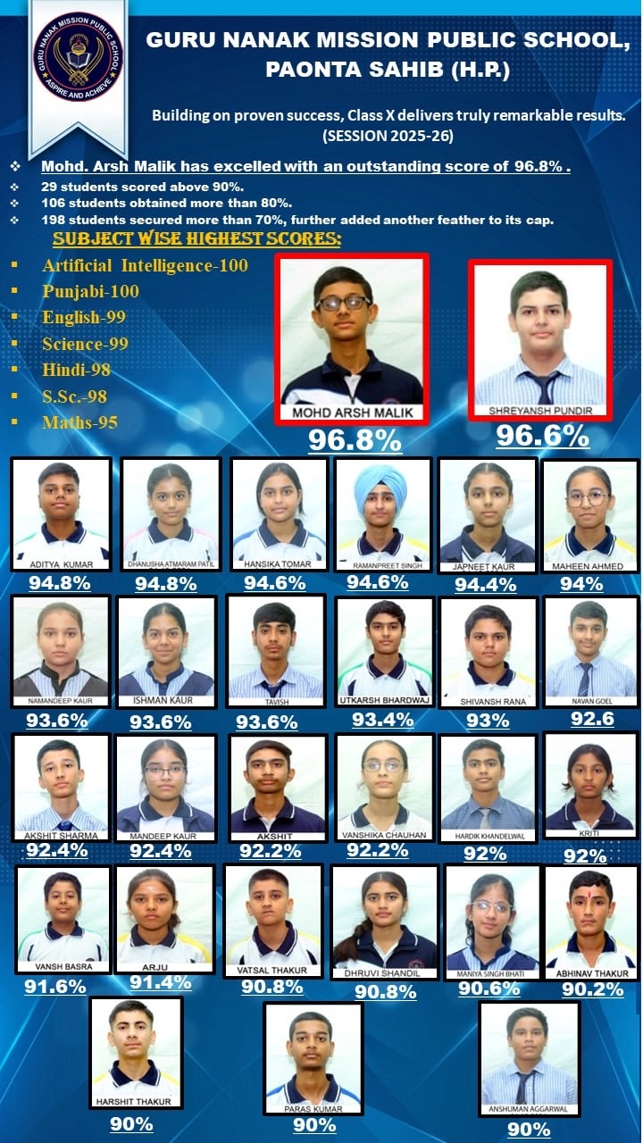 पांवटा साहिब, 17 अप्रैल (कपिल शर्मा) : सीबीएसई द्वारा घोषित कक्षा 10वीं के परीक्षा परिणाम में गुरु नानक मिशन पब्लिक स्कूल, पांवटा साहिब के विद्यार्थियों ने उत्कृष्ट प्रदर्शन करते हुए विद्यालय का नाम रोशन किया है। अनुशासन, गुणवत्तापूर्ण शिक्षा और आधुनिक शिक्षण पद्धति के लिए पहचाना जाने वाला यह विद्यालय क्षेत्र में शिक्षा का एक प्रमुख केंद्र बन चुका है, जहां शैक्षणिक उत्कृष्टता के साथ-साथ नैतिक मूल्यों और समग्र विकास पर विशेष जोर दिया जाता है। इस वर्ष स्कूल का परीक्षा परिणाम शत-प्रतिशत रहा, जिससे पूरे विद्यालय में खुशी और उत्साह का माहौल है। विद्यालय के छात्र मोहम्मद अर्श मलिक ने 96.8 प्रतिशत अंक हासिल कर विद्यालय में शीर्ष स्थान प्राप्त किया। विद्यालय के कुल 29 विद्यार्थियों ने 90 प्रतिशत से अधिक अंक प्राप्त किए, जबकि 106 छात्रों ने 80 प्रतिशत से ऊपर अंक अर्जित किए। वहीं 198 विद्यार्थियों ने 70 प्रतिशत से अधिक अंक प्राप्त कर शानदार सफलता दर्ज की। विषयवार अधिकतम अंकों में भी विद्यार्थियों ने बेहतरीन प्रदर्शन किया। पंजाबी और आर्टिफिशियल इंटेलिजेंस में 100-100 अंक, इंग्लिश और साइंस में 99-99 अंक, हिंदी और सोशल साइंस में 98-98 अंक तथा गणित में 95 अंक प्राप्त किए गए। परिणाम घोषित होते ही विद्यालय परिसर में हर्ष और उल्लास का वातावरण बन गया। छात्र-छात्राएं और उनके अभिभावक खुशी से झूम उठे।