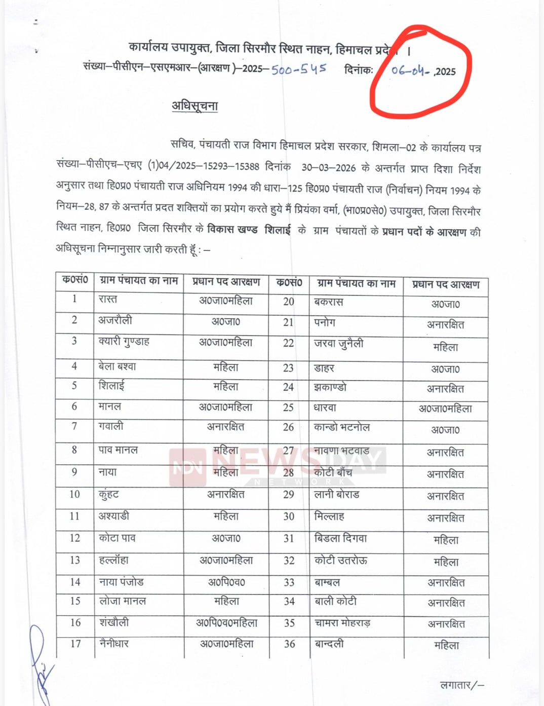 न्यूज़डे नेटवर्क डेस्क:- सिरमौर जिले में आगामी पंचायती राज चुनावों को लेकर सभी विकास खंडों के रॉस्टर जारी कर दिए गए हैं। लेकिन विकास खंड शिलाई के प्रधान पद के लिए जारी रॉस्टर में वर्ष 2025 की तारीख अंकित होने से लोगों में भ्रम की स्थिति पैदा हो गई। रॉस्टर सामने आते ही क्षेत्र में चर्चा का माहौल बन गया और लोग यह समझ नहीं पा रहे थे कि क्या यह पुराना दस्तावेज है या फिर कोई नई सूची? कई लोगों ने एक-दूसरे से फोन के माध्यम से संपर्क कर जानकारी का सत्यापन करना शुरू कर दिया। हालांकि, जब अन्य विकास खंडों के रॉस्टर भी एक साथ सामने आए और एसडीएम शिलाई की ओर से स्थिति स्पष्ट की गई, तब जाकर लोगों को कुछ राहत मिली। अब इसे महज एक क्लेरिकल मिस्टेक माना जा रहा है, इसके बावजूद, तारीख को लेकर लोगों में कुछ समय तक असमंजस बना रहा।